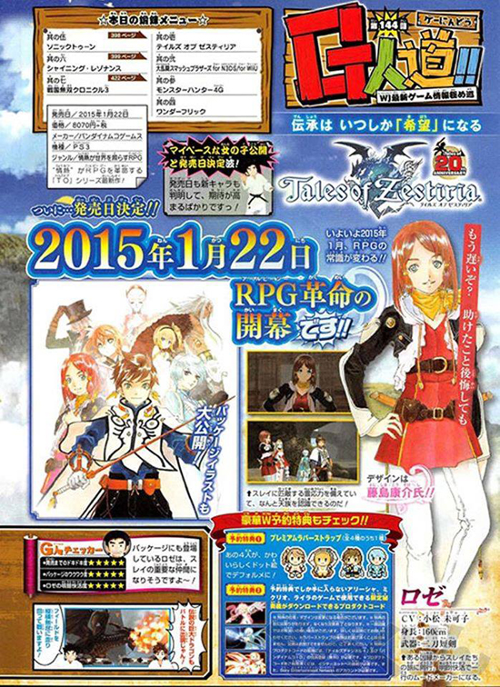 Ook niet onbelangrijk: op 22 januari 2015 zal Tales of Zestiria op de Japanse markt verschijnen. Ondanks dat de makers een wereldwijde release hebben beloofd, is er nog niets bekend over wanneer de game een Westerse release zal krijgen. De JRPG is in ontwikkeling voor de PlayStation 3.