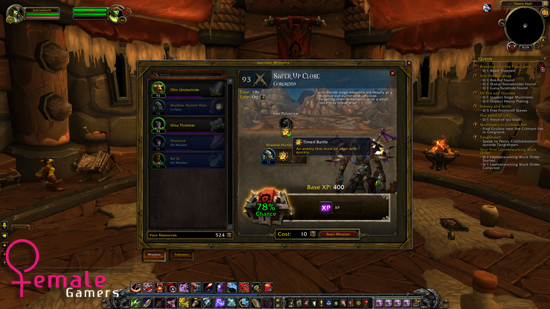 Zoals je nu al een aantal keer hebt gelezen zijn er leuke dingen naast het bouwen binnen de Garrison te doen. Een van de leukste en ook meest verslavende ding dat ik nu doe binnen de Garrison zijn de Garrison missions. In het begin krijg je een follower, een poppetje dat er alles op alles zet om voor jou te winnen. Deze followers krijg je door missies te winnen, de wereld te verkennen, je reputatie en -wanneer je die gebouwd hebt- in je Garrison The Inn. Om een Garrison missie te starten ga je naar Warmaster Zog. Voor hem staat een tafel waarop een map ligt met allemaal zwaarden. Je klikt op de tafel en je Garrison Missions menu verschijnt. Hierna kies je een missie en in het menu zie je links de followers staan waar je uit kan kiezen. Bekijk goed wat de missie nodig heeft om te slagen, je ziet dit sowieso door het slagingspercentage wat verschijnt, maar met wat leeswerk kom je erachter welke follower de juiste krachten heeft om de missie te doen slagen. Bij de missie staat ook meteen wat je krijgt wanneer de missie slaagt en hoe lang deze duurt. Voor de wat grotere missies heb je meer followers tegelijk nodig en de korte en kleine missies worden vaak door een follower gedaan. Bij de missies staat ook vanaf welk level de missie een grotere slagingspercentage heeft. Al wil dit niet automatisch zeggen dat wanneer je een hoger level inzet je gegarandeerd wint. Heb je dit allemaal gedaan kun je ondertussen verder questen met je karakter of gewoon lekker een serie tussendoor kijken om later te ontdekken of je Garrison Missie geslaagd is en je beloning op te halen.