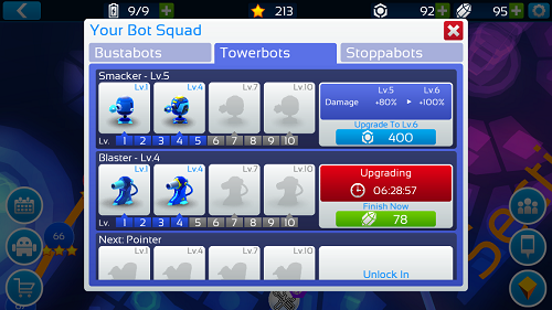 Nog niet alle soorten bots zijn zichtbaar, die ontgrendel je pas later. De bots die je wel kan upgraden zijn gekleurd en onder de bots staan de huidige levels aangegeven die je nu bezit. Een volgend level kan rechts van de bots gekocht worden met Orbs. Een upgrade wordt dan uitgevoerd, dat duurt eerst niet zo lang maar hoe sterker je bots worden hoe langer het gaat duren voor de upgrade klaar is. Helaas geeft het spel niet van tevoren aan hoe lang de upgrade gaat duren. Duurt het je te lang dan kan je de upgrade meteen voltooien door Crystals te gebruiken, als je ze hebt. Bij iedere soort bot zijn ook een aantal statistieken te zien. Hun aanvalssterkte of bepantsering is wel te zien, maar je hebt het niet echt nodig om je keuze te maken. Vaak merk je tijdens de levels wel dat een aanvallende bot inmiddels niet sterk genoeg meer is, waarna je de bot gaat upgraden.