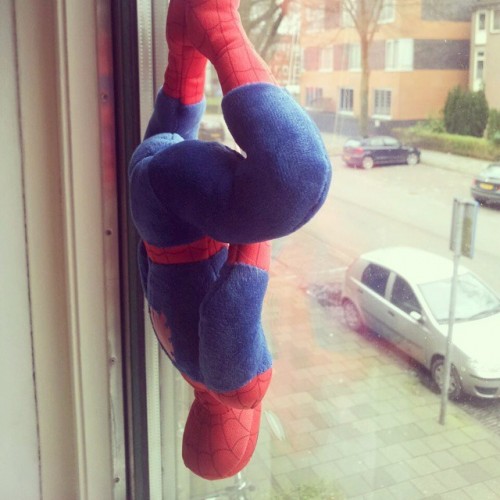 Heather verzameld de gekste dingen van Marvel of eigenlijk gewoon van alles. Zo heeft ze Spidy aan haar raam hangen. Het is weer een keer iets anders dan die opplak ooievaars.