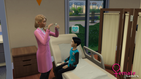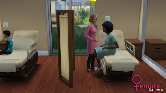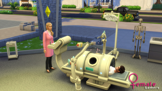 Omdat ik erg nieuwsgierig was naar hoe een bevalling eruit ziet ben ik als eerste aan de slag gegaan als dokter. Wat ik meteen even wil aangeven is dat met de nieuwe uitbreiding er een heel handige toevoeging is bijgekomen. Als je namelijk met je familie begint en je sim moet aan het werk krijg je te zien waar je sim op het werk mee bezig is en kan je kiezen of je met de sim mee gaat of deze alleen weg stuurt. Dit is zo ontzettend handig voor wanneer je even een tijdje niet meer met je sims familie hebt gespeeld. Ik koos er dus voor om een dagje mee te lopen met mijn dokter sim. Terwijl ze een paar onderzoeken deed bij een sim met rare rode vlekken kwam er een zwangere vrouw aan de balie die op het punt van bevallen stond. Vol enthousiasme begeleide ik haar naar de operatietafel en bracht ik met een futuristische machine, die ik zelf niet op mijn bevalling zou willen zien staan, de baby in een dichte bundel ter wereld. De baby verdween ook net zo snel als het verscheen en moeder leek met lege handen naar huis te gaan ware het niet dat er in mijn ervaringen rechtsboven te lezen was dat de operatie geslaagd was. Persoonlijk vond ik dit een beetje raar aanvoelen en was ik teleurgesteld dat ik niet de naam nog van het kindje zag of dat ik moeder met een maxi-cosi naar buiten zag lopen. De onderzoeken, diagnose stellen en het behandelen van patiënten vond ik wel heel erg leuk en vermakelijk om te doen.