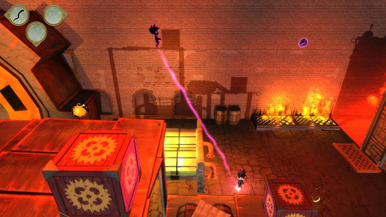 Het verhaal is vrij simpel toch? Maar nu begint het spel, alleen krijg je geen uitleg over de besturing en heb je geen idee wat je moet doen. Toen ik de knop escape indrukte, kreeg ik toch wat uitleg over de besturing, het jongetje beweeg je met de pijltjes en hij kan springen met spatie, maar je moet tegelijkertijd ook je schaduw besturen met de A- en D-knop en met je linker shift kan hij springen, het duurde een tijdje tot ik de besturing onder de knie kreeg. Vervolgens moet je beide, het jongetje en de schaduw, door de levels heen loodsen en een beetje puzzelen hoe jouw schaduw aan de andere kant van het level te krijgen en visa versa. Maar pas op, je kunt niet te ver uit elkaar gaan! Er zit een paarse lijn tussen jou en de schaduw en als je te ver weg loopt verandert de lijn en kan je zelfs dood gaan.