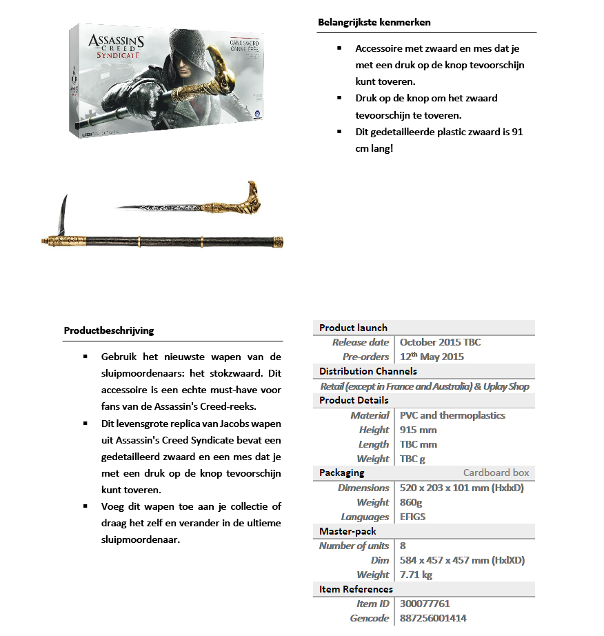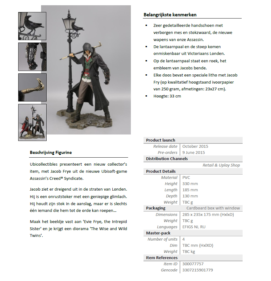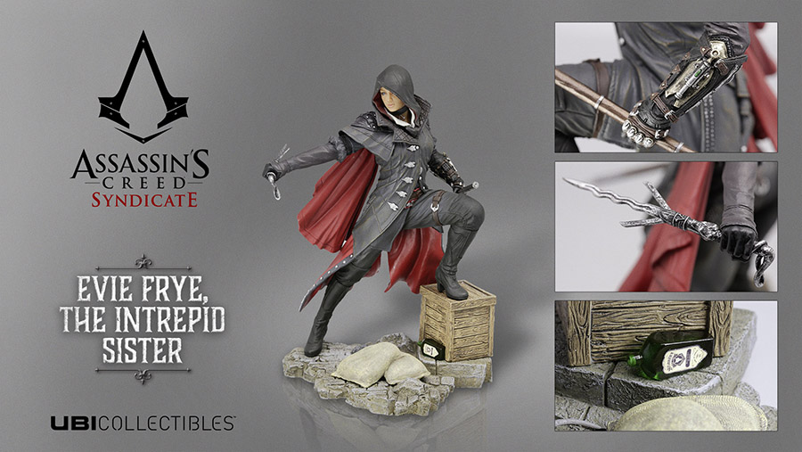 Tot slot kondigt UbiCollectibles twee hele gedetailleerde Assassin’s Creed figurines aan die in oktober 2015 verkrijgbaar zullen zijn. De Jacob Frye figurine toont de opstandige broer in een intimiderende pose in de straten van London, gewapend met zijn zeer gedetailleerde gauntlet en cane sword. De Evie Frye figurine toont de moedige en dappere zus van Jacob Frye. Iedere figurine komt met een specialie lithografie. Gecombineerd vormen deze twee zeer gedetailleerde figurines “The Wise and Wild Twins” diorama.