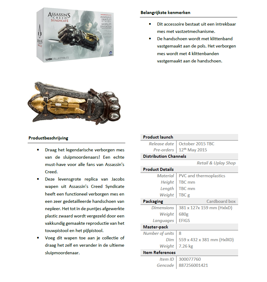 Twee van Jacob’s iconische wapens zijn in oktober 2015 verkrijgbaar. Het eerste wapen is een levensechte replica van de legendarische Assassin handschoen met hidden blade. De hidden blade werkt echt en is afgewerkt met rope launcher en dart gun.