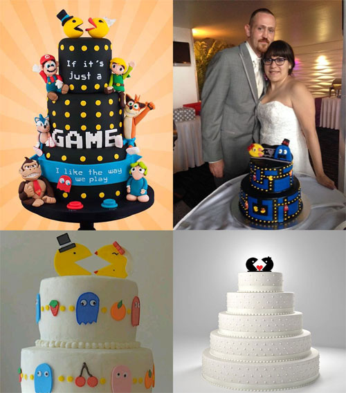 Als het dan tijd is voor taart kan je daar op verschillende manieren Pac-Man in terug laten komen. Laat je een hele grote taart maken waarbij Pac-Man en de Ghosts achter elkaar aan laat zitten? Of houd je het subtiel door een witte taart te nemen met een Pac-Man caketopper? Viermaal inspiratie voor je bruiloftstaart v.l.n.r. Taart 1, Taart 2, Taart 3, Taart Topper @ Etsy Bee3DGifts