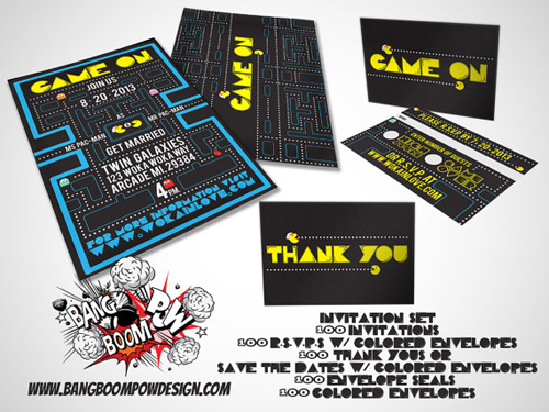 Een compleet pakket met Save the Date kaarten, de uitnodiging, bedank kaartjes enzovoorts kan je vinden via de Etsy Shop: BangBoomPowDesign. Ook andere games worden hier vertegenwoordigd.