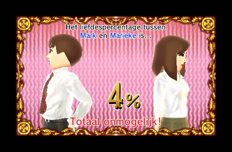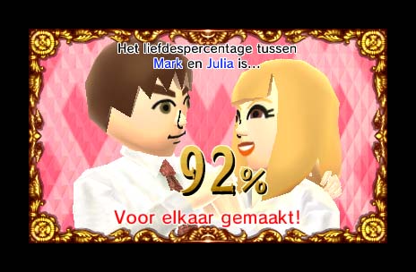 Grapje natuurlijk, maar zoals je op de afbeeldingen hieronder en boven ziet, is de game erg toegespeeld op die beleving van liefde. Je kunt op basis van namen (denk ik?) uitrekenen in hoeverre twee Mii’s een match zijn. Het doet soms een beetje denken aan die sms-services die je vroeger had bij The Box en andere televisiezenders, waarbij je kon smsen en dan zou horen hoeveel procent jij en je crush bij elkaar pasten, maar deze versie is gratis dus veel beter!