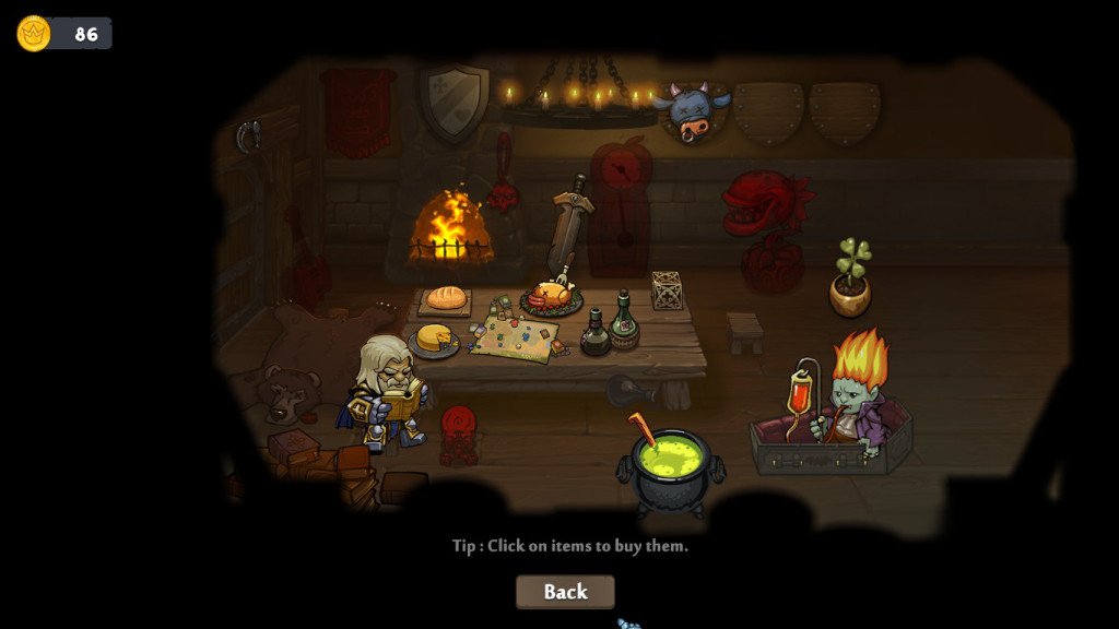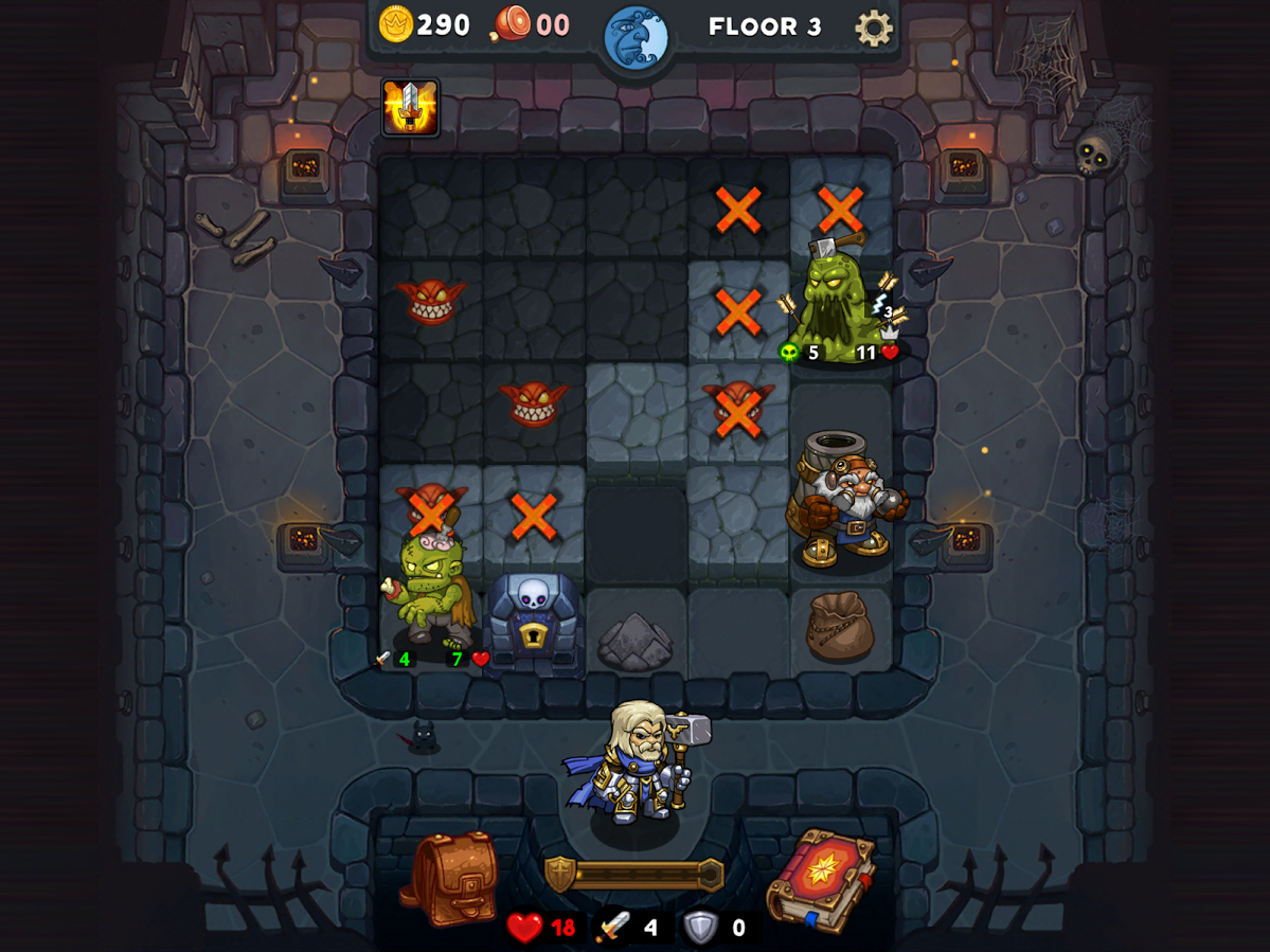 Nu zou je denken dat een Minesweep-noob als ik dus niet zo ver kom met Dungelot, maar dat valt mee. Het voordeel is namelijk dat de game een hele grappige en handige uitleg heeft van de gameplay. Steeds als je een blokje aantikt, dan gebeurt er niks of verschijnt er een wezen dat weer een bepaalde betekenis heeft. Je zoekt naar een sleutel die onder een van die tegels ligt, en die wezens maken het moeilijk om alle tegels om te draaien. Je zal ze moeten bevechten om ook de tegels om hen heen te kunnen checken, waar niet alleen de sleutel kan liggen, maar ook loot zoals extra health en betere wapens om tegen de monsters te vechten.