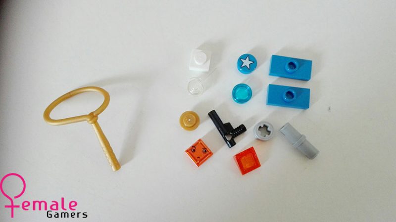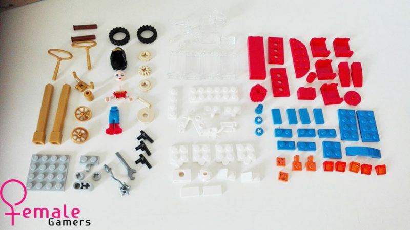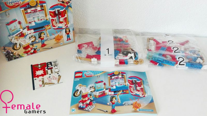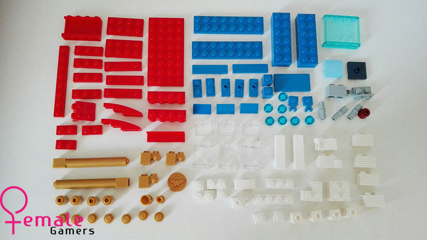 Bij het uitpakken van de doos kom ik een tweetal zakjes tegen met blokjes, een velletje stickers en een bouwboekje. Opvallend is dat bijna alles in de kleuren rood-wit-blauw zijn, naast dat het natuurlijk de kleuren zijn van onze vlag, staan deze kleuren met een vleugje goud symbool voor de kleuren van Wonder Woman.
