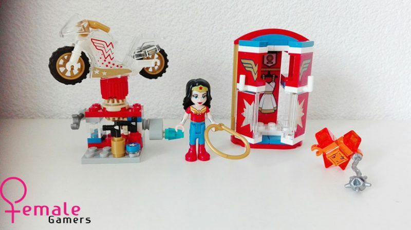 Het eerste zakje bouwstenen bevat al een flink deel van deze set. Zo heb ik de kledingkast, voorzien van diverse stickers, in elkaar gezet, net als de werkplaats van de motor. De motor staat op een plateau en als je aan de hendel draait, draait ook de motor rond, een pronkstuk midden in je slaapkamer. Ook Wonder Woman mag natuurlijk niet ontbreken met haar lasso en hebben we hier een oranje kryptomite!