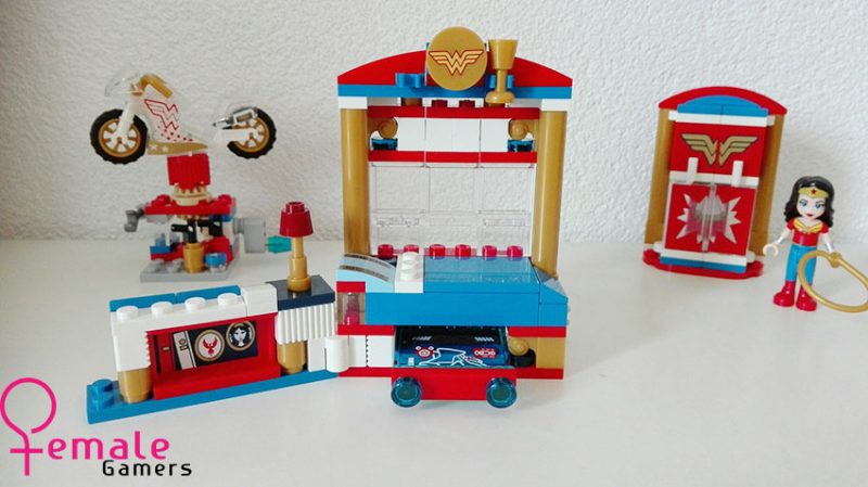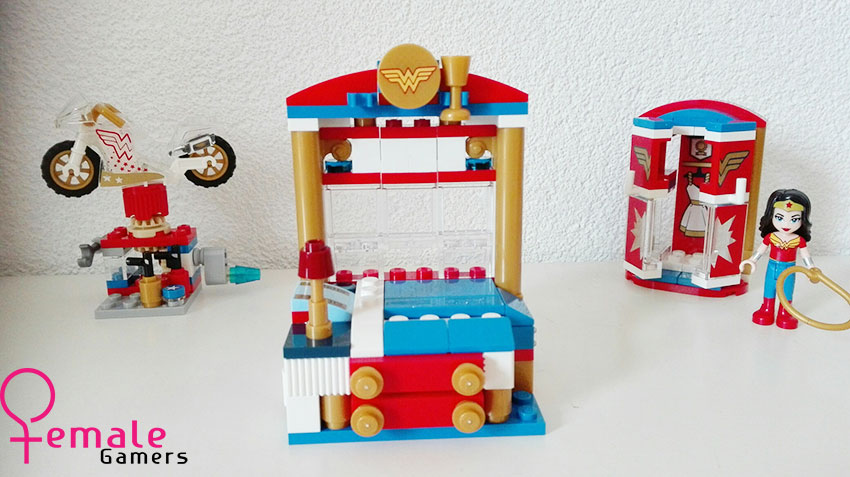 Het idee achter deze Super Hero Girls set van Wonder Woman is dat we een kijkje mogen nemen in de slaapkamer van deze dame en hierbij mee kunnen helpen aan het repareren van haar onzichtbare motor. Maar ook hier zijn de vervelende kryptomites weer van de partij en hebben ze zich verstopt in de kledingkast en azen ze op de lasso van Wonder Woman.