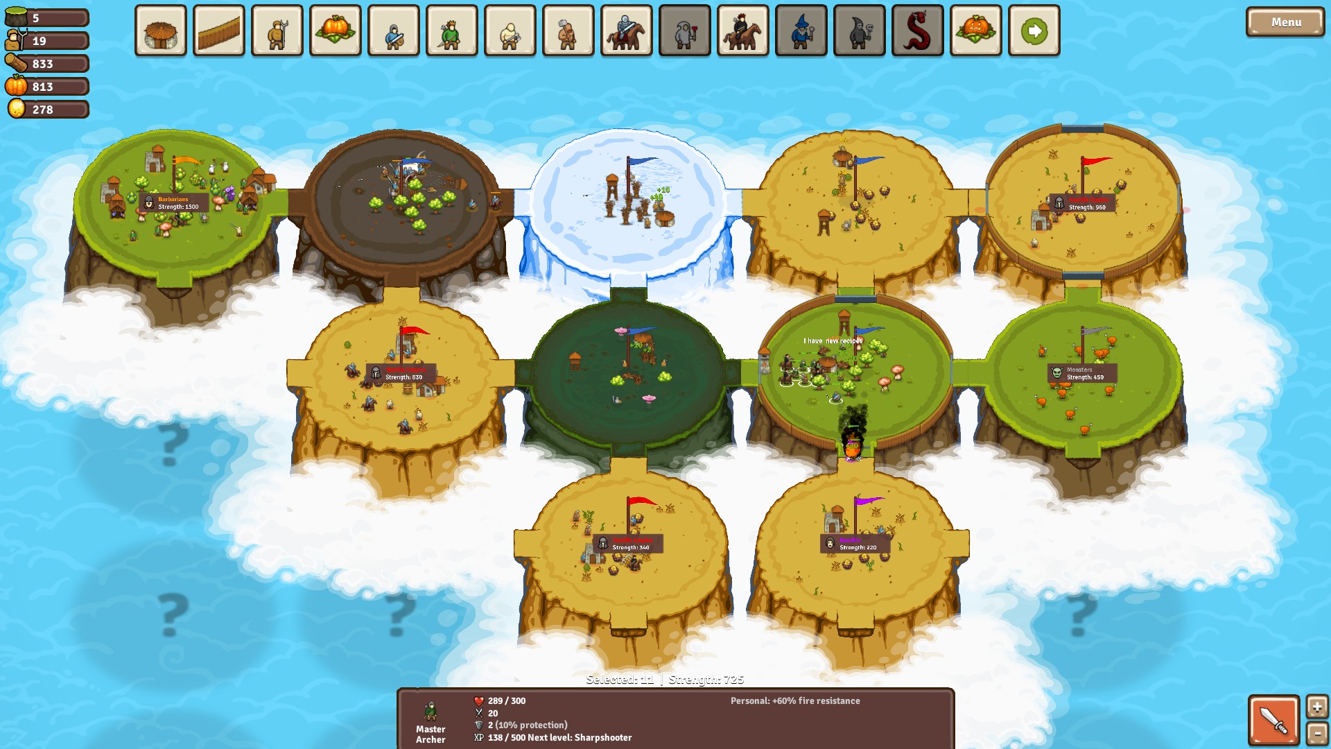 Het begint allemaal echter met het kiezen van een leider, want zonder leider kun je het leger natuurlijk nooit al die cirkels laten veroveren. Elke leider geeft je andere startwaardes voor bijvoorbeeld hout, goud en voedsel. Daarnaast voegen ze ook wat toe aan overgenomen cirkels, zoals torens, een muur of een aantal krijgers. Bij de meeste leiders begint je in ieder geval met een aantal struiken om voedsel van te verzamelen, bomen om hout van te verzamelen en een aantal werkers om dit voor je te doen. Vervolgens is het aan jou om te bedenken wat je nodig hebt, meer werkers, meer bronnen of misschien moet je alvast een leger gaan opbouwen. Dit kost natuurlijk allemaal hout, voedsel en geld, dus je kunt niet zomaar wat uitgeven, zeker niet als er allemaal legers zijn die jouw cirkel willen veroveren. Dit leger kan uit heel veel verschillende units bestaan die close combat of ranged zijn en hier en daar zit er wat magie tussen. Daarnaast kun je nog een speciaal gebouw neerzetten, waarmee je monsters voor je leger kunt creëren of je zet een monsterpompoen neer die zowel voedsel als random een monster aan je leger toevoegt.