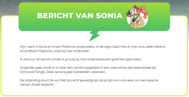The Pokémon Company International en Nintendo hebben reeds bekend gemaakt dat Trainers op vrijdag 4 oktober om 15.00 uur (Nederlandse tijd) een 24-uurs livestream die Pokémon Live Camera heet kunnen volgen. De livestream zendt unieke beelden uit van een camera die opgesteld staat in Glimwood Tangle, een gebied in de regio Galar.