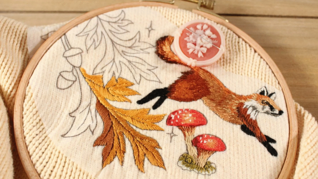 Heb je nog een kledingstuk die je inmiddels wat aan de saaie kant vindt? Doe hem dan niet weg, maar doe een poging om er iets moois op te borduren. Denk bijvoorbeeld aan deze vos met herfstige bladeren en paddenstoelen, of regenboogbloemen.