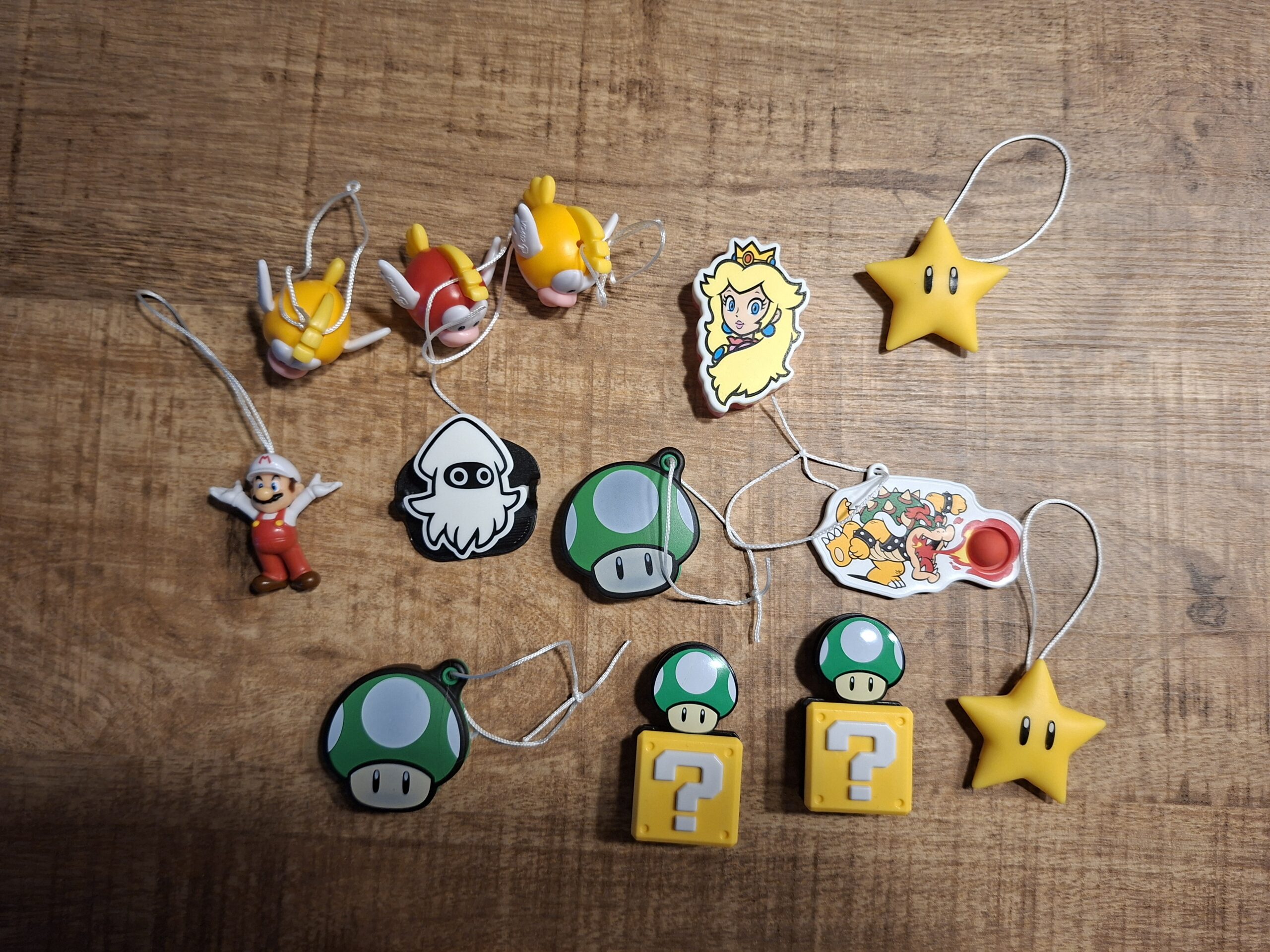 De hangertjes zijn er in Mario, Vuur-Mario, Luigi, Vuur-Luigi, Yoshi, Yoshi geel, Goomba, Cheep Cheep rood, Cheep Cheep geel en de ster. Verder heb je fotohouder, een pentop (om aan de bovenkant van je pen te doen, een plastic ding met sticker met een pop-it geval (gelukkig met touwtje, dus kan in de boom), clips om papier bij elkaar te houden, iets van paperclip-achtige dingen, een question block-hanger, 2 kleuren markers met een toad én haakjes om iets aan te hangen. We zijn nog lang niet compleet, maar we hopen wel ver te komen. Yoshi en Goomba staan nog heel hoog op het verlanglijstje.