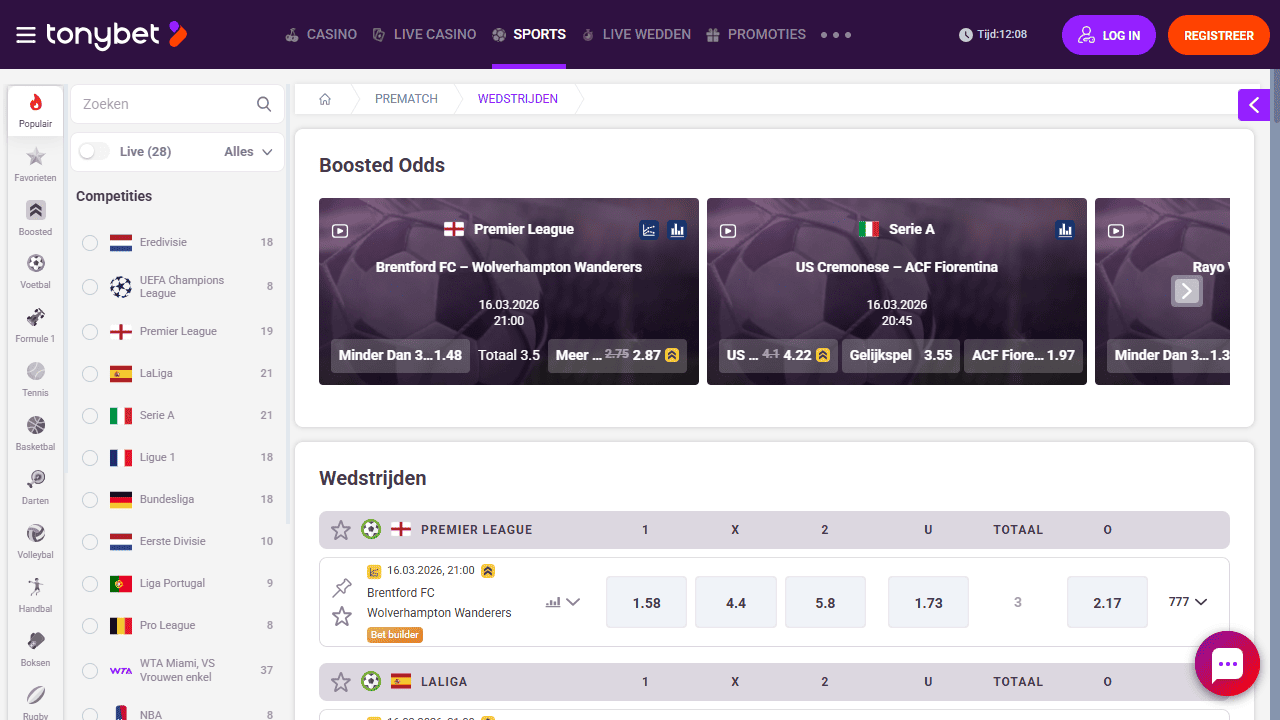 TonyBet is een sterke keuze voor spelers die zoeken naar een alternatief voor bookmakers zonder Cruks met een uitgebreid sportaanbod. Het platform biedt weddenschappen op tientallen sporten, met veel aandacht voor populaire competities zoals de Eredivisie, Champions League en internationale toernooien. Daarnaast zijn er functies zoals Cash Out en Bet Builder, waarmee je weddenschappen kunt aanpassen of vroegtijdig kunt afsluiten. De Combo Boost-promotie kan combinatieweddenschappen bovendien extra waarde geven.